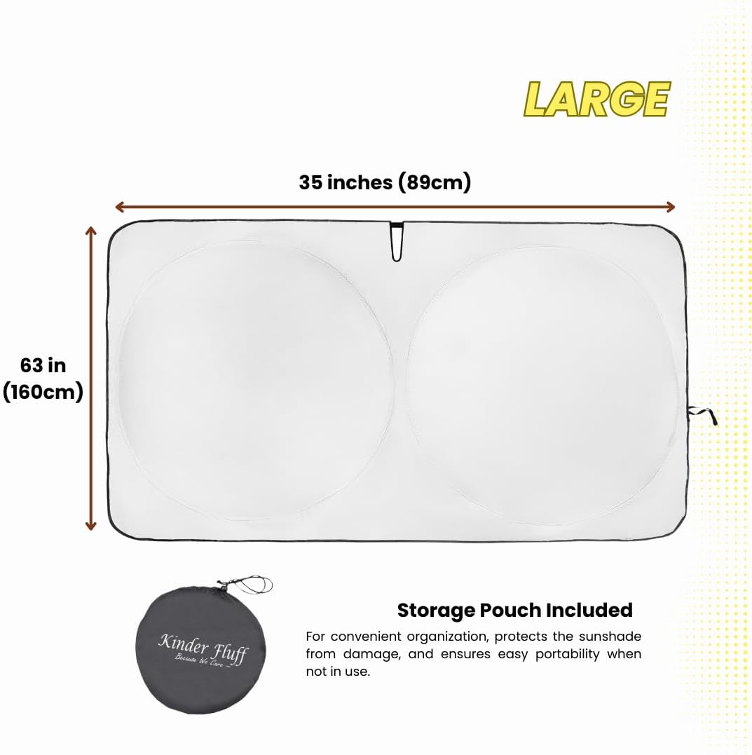 The large size of this sun shade measures 63x34.86 inches when fully open and 52x34.86 inches when overlapped, making it ideal for cars, SUVs, trucks, jeeps, and vans with windshields that are no larger than 63" x 30". It is recommended to measure your windshield before purchasing to ensure the best fit.