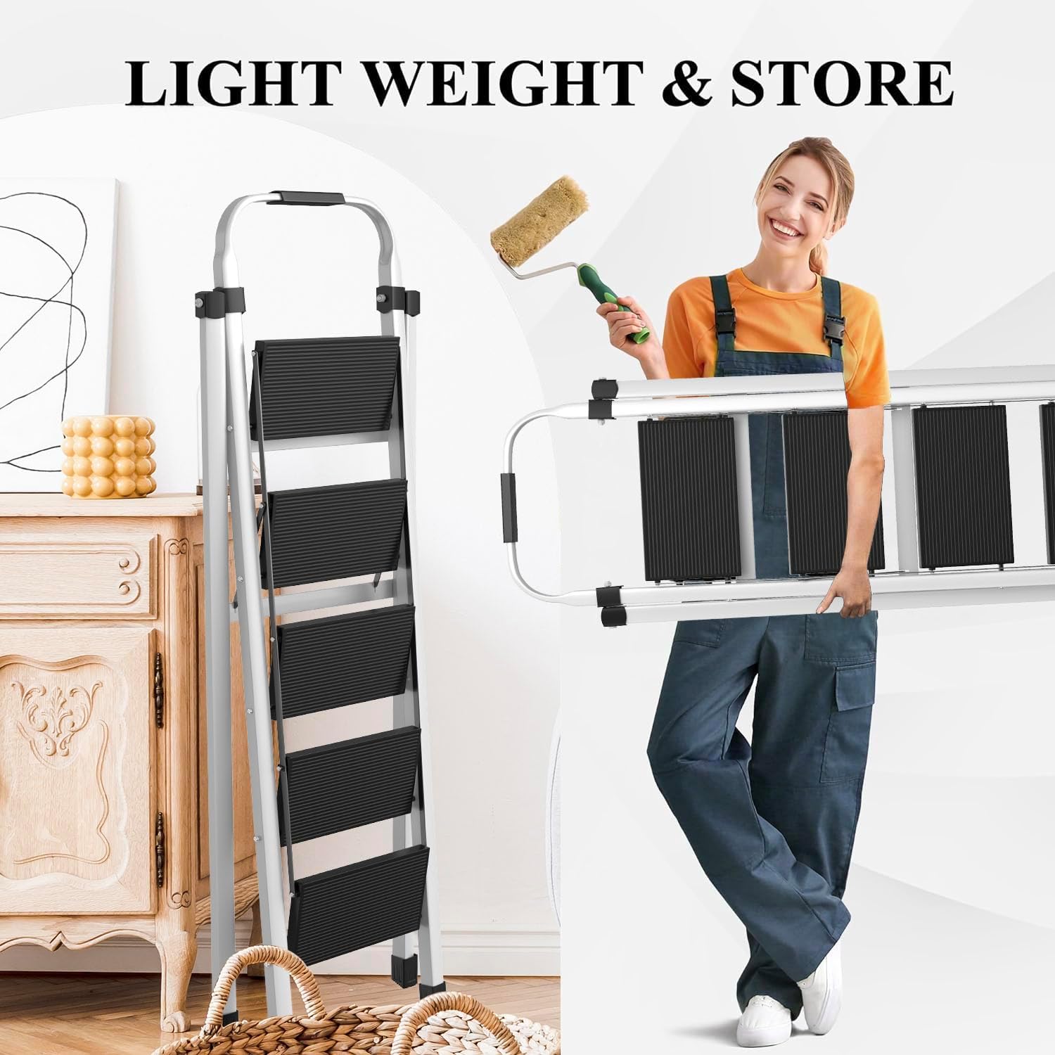 Our foldable 5-step ladder is a versatile and practical solution for indoor and outdoor use. It features a wide anti-slip pedal for added stability and safety, and has a capacity of 220KG. The ladder is made of sturdy steel, yet is lightweight and space-saving, making it easy to store and transport. The foldable design allows for easy setup and takedown, and the ladder is safe and stable to use.