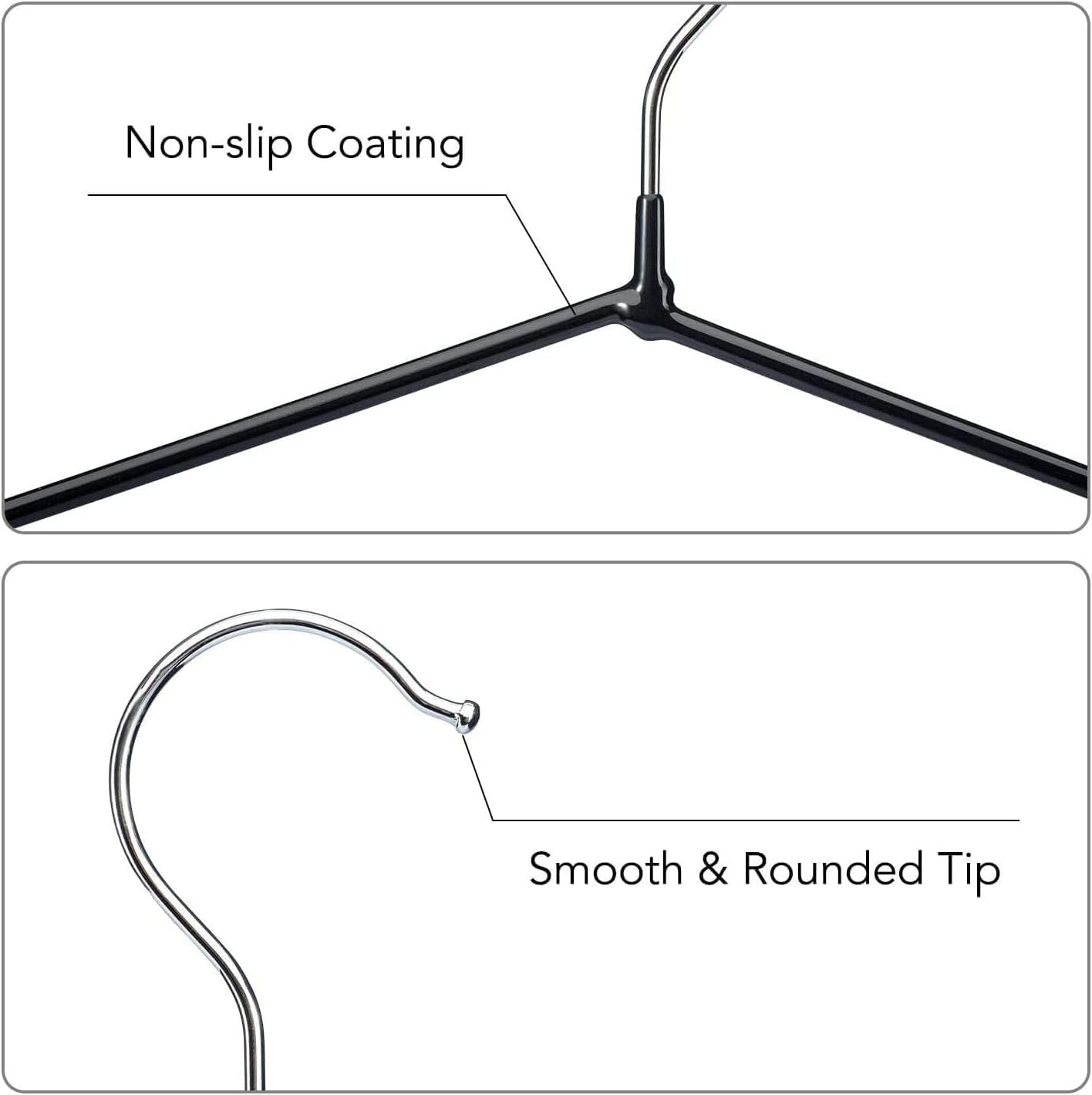 The hangers have a sleek design and are available in black color. They are easy to use and can be hung in a closet or on a hook. The metal frame provides strength and durability, while the plastic coating gives a smooth finish.