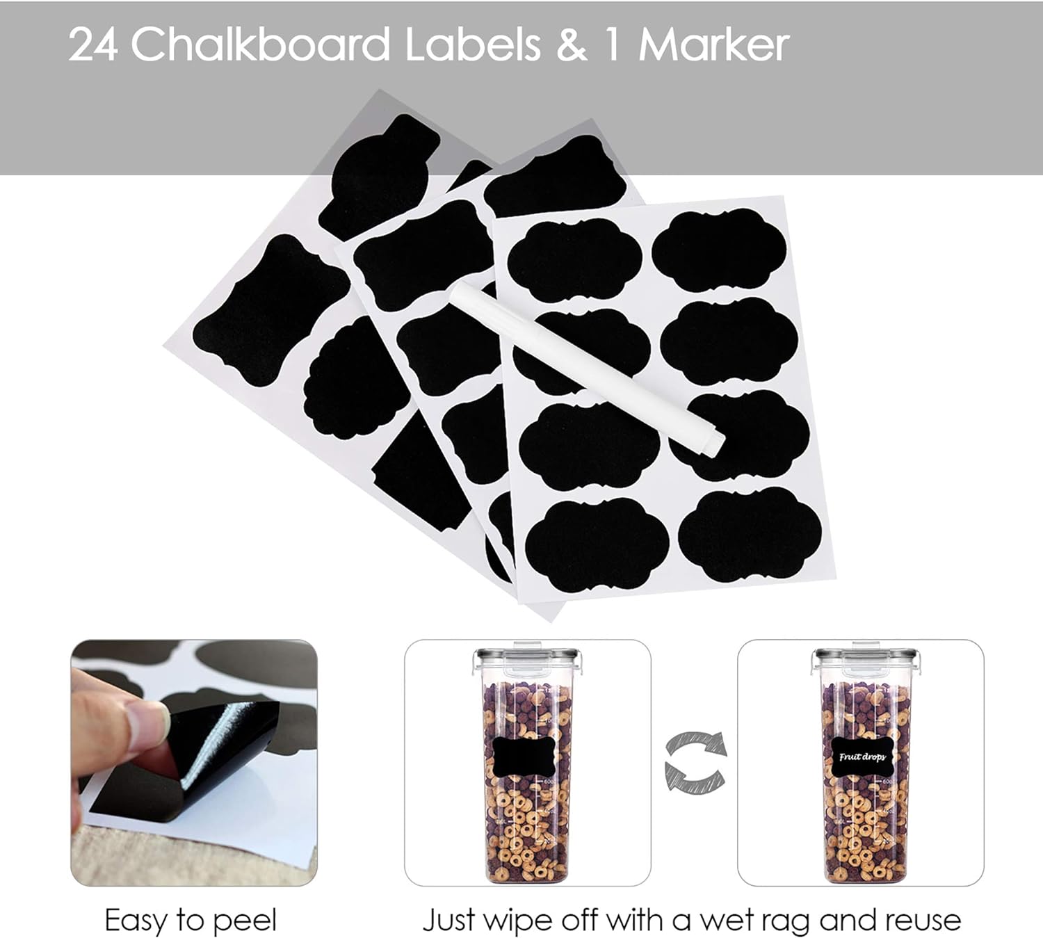The containers come with 24 chalkboard labels, allowing you to easily identify what's inside each container. This feature is particularly useful if you have multiple types of cereal or snacks stored in the containers. The labels are also reusable, making it easy to change the contents of the containers without having to replace the labels.