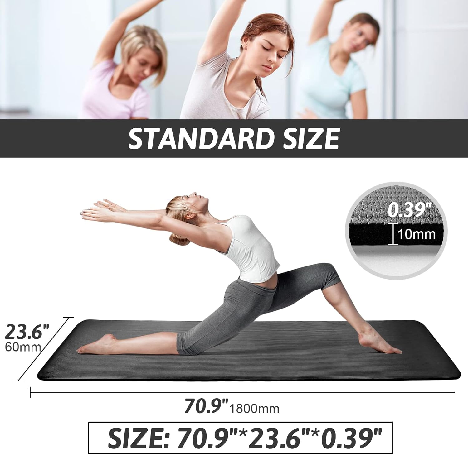 This yoga mat is designed to provide a comfortable and non-slip surface for your workouts. It is made of a durable material that is skin-friendly, non-toxic, and perfect for those with sensitivities. The mat is 10mm thick, making it ideal for high-intensity interval training, Pilates, yoga, and other home workouts.