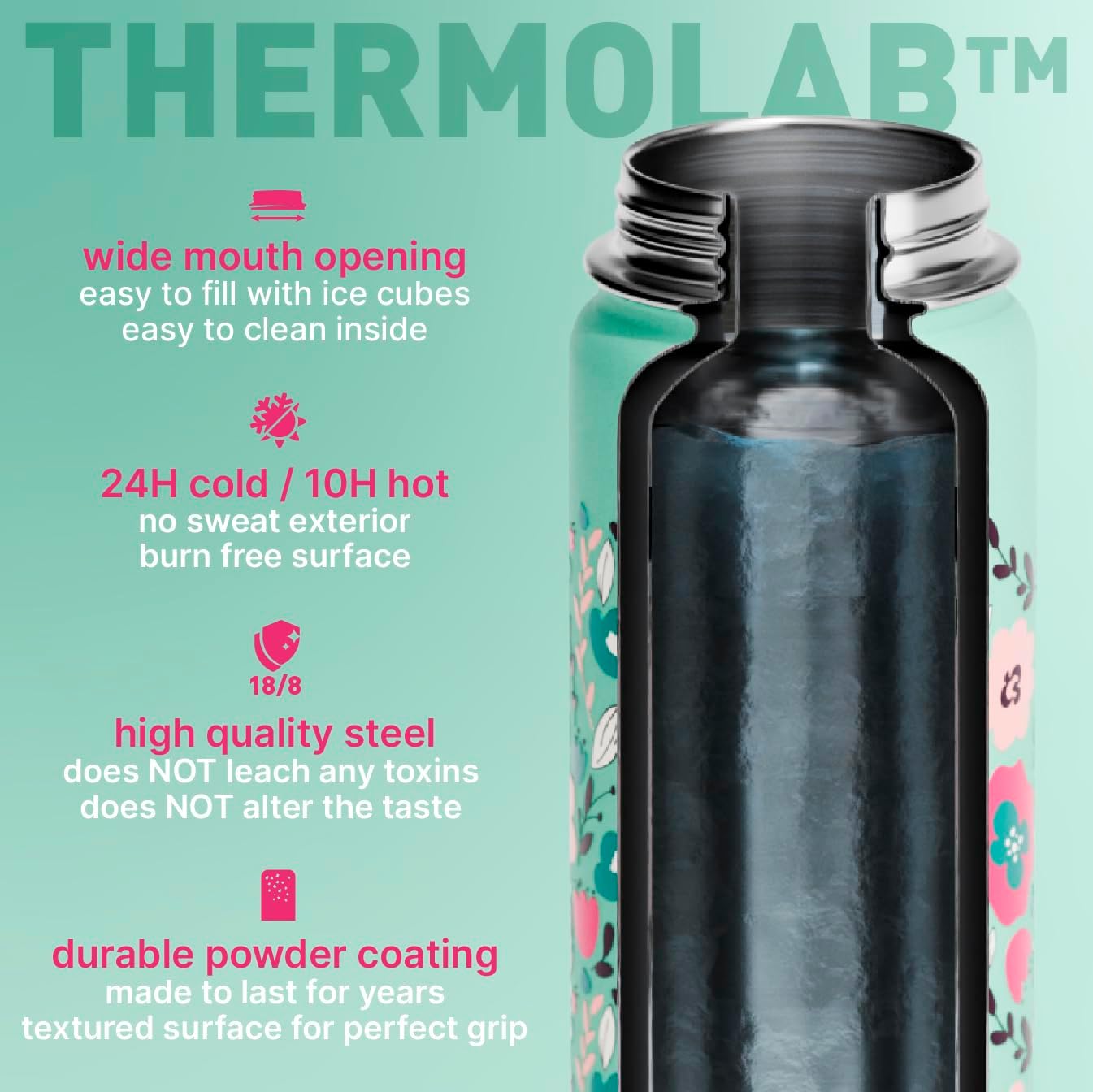 This kids water bottle is designed to keep drinks hot or cold for hours, making it perfect for school or sports. The double wall insulated thermos bottle is made of 18/8 stainless steel, which is durable and resistant to rust. The wide mouth of the bottle makes it easy to clean and add ice cubes.