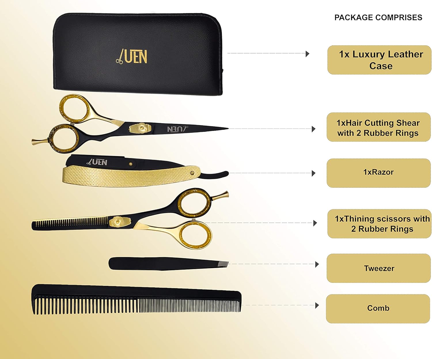 This professional hair cutting scissors set is an all-in-one kit that meets all your haircutting and styling needs. The kit includes a hair scissors, thinning shear, hair razor comb, cleaning cloth, comb, hairpins, and a PU leather bag.